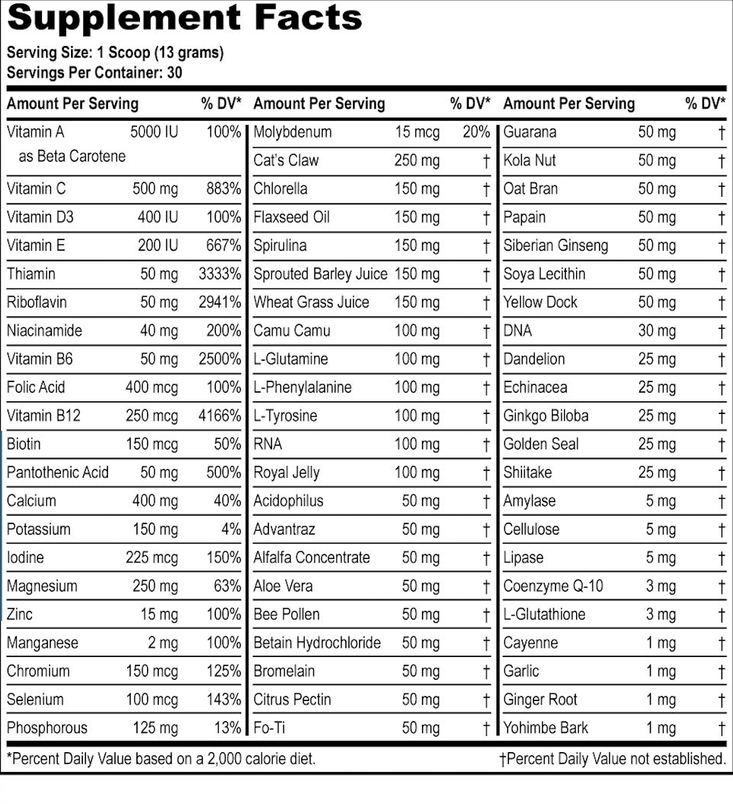 Mega Multi-Vitamina Plus es un suplemento multinutriente completo que contiene vitaminas, minerales, enzimas, hierbas, aminoácidos y otros nutrientes esenciales para apoyar la salud óptima y el funcionamiento adecuado de los sistemas del cuerpo.